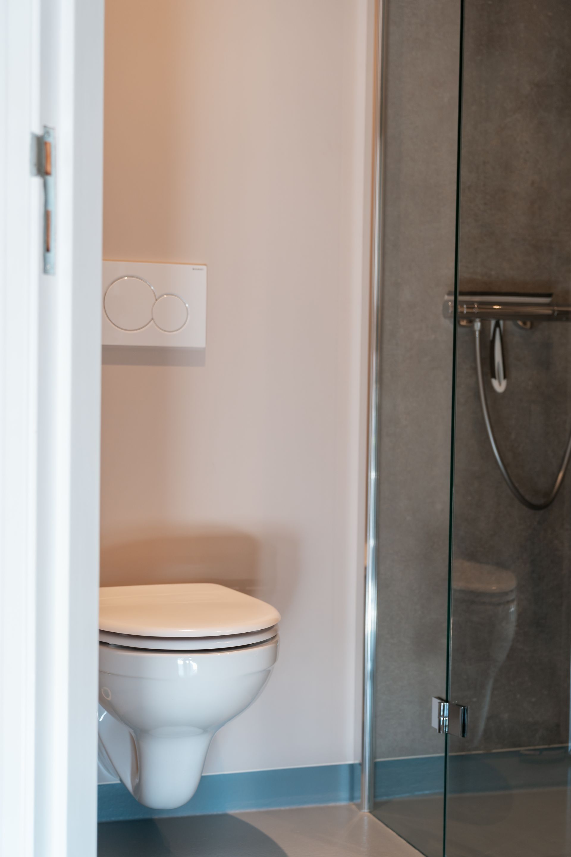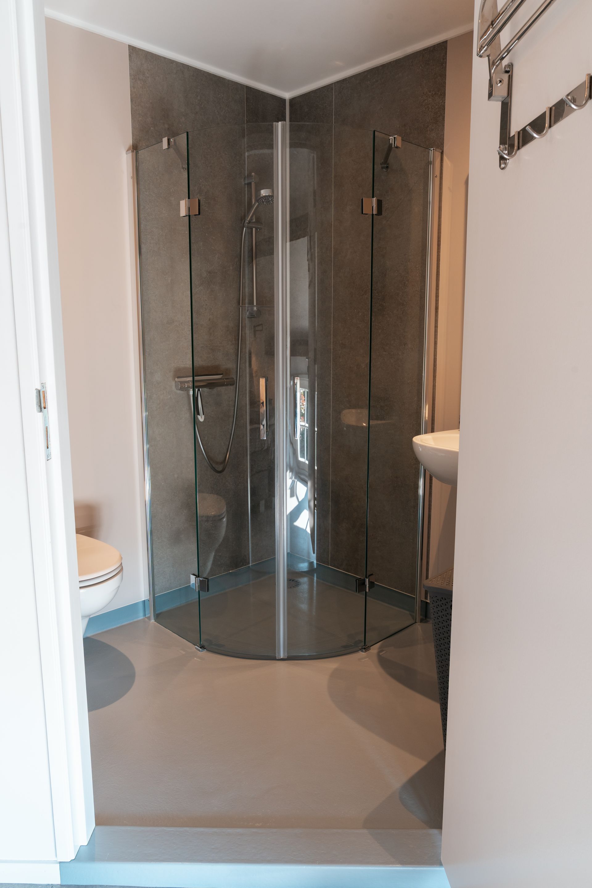 Dieser Raum ist praktisch eingerichtet und bietet alles, was Sie für ein komfortables und angenehmes Erlebnis benötigen. Sie finden eine wunderbare Dusche mit einem benutzerfreundlichen Thermostathahn, mit dem Sie ganz einfach die ideale Wassertemperatur für eine erfrischende oder entspannende Dusche einstellen können. Eine Toilette und ein Waschbecken sind ebenfalls vorhanden und tragen zum Komfort und zur Funktionalität des Raumes bei.