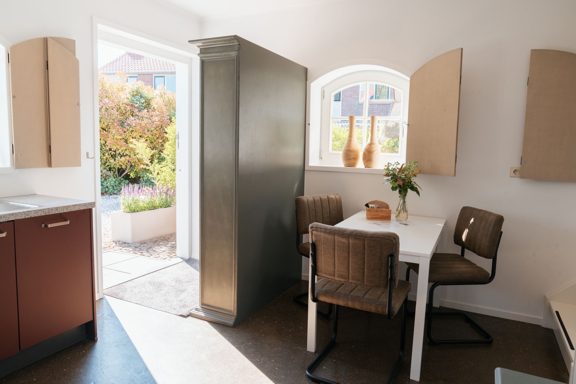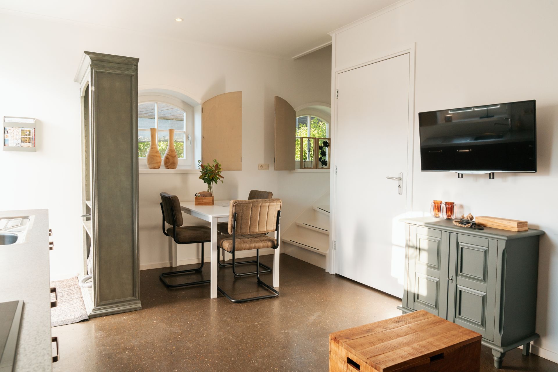 Außerdem finden Sie hier einen Esstisch mit bequemen Stühlen.