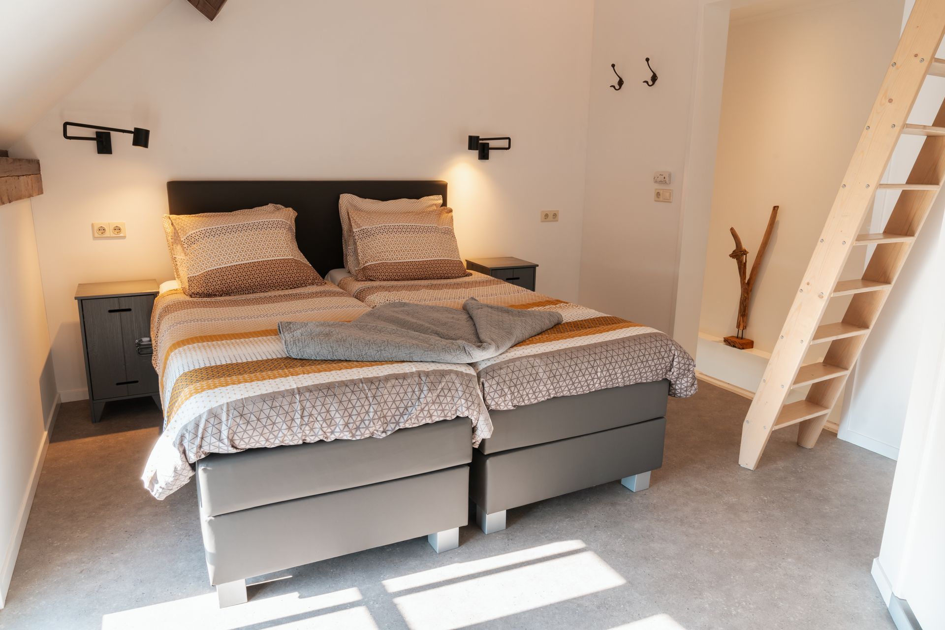 Ein wichtiger Raum, dem wir besondere Aufmerksamkeit geschenkt haben, ist das Schlafzimmer. Hier finden Sie zwei bequeme Boxspringbetten für je zwei Personen, die für hohen Schlafkomfort sorgen. Die stilvolle Einrichtung und die durchdachte Raumaufteilung tragen zu einer entspannten Atmosphäre bei, in der Sie sich so richtig entspannen können. Der Kleiderschrank ist mit durchdachten Regalen und Hängemöglichkeiten inklusive Kleiderbügeln ausgestattet. So können Sie Ihre Kleidung ordentlich verstauen und haben ausreichend Platz für Ihr Gepäck. Der Kleiderschrank ist außerdem so konzipiert, dass Sie Ihren Koffer problemlos darunter verstauen können, um den verfügbaren Platz optimal zu nutzen.