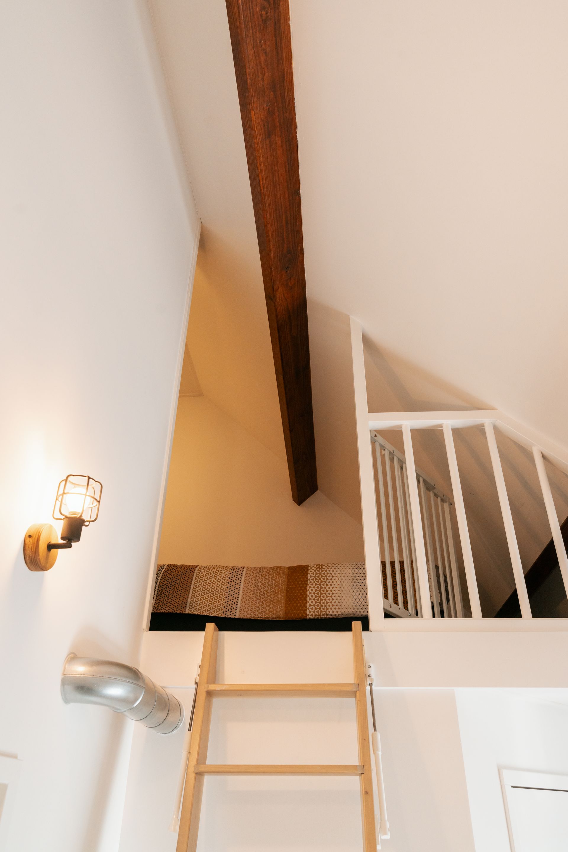 Über dem Badezimmer haben wir einen charmanten Schlafboden geschaffen, eine einzigartige Ergänzung des Hauses. Dieser einzigartige Raum ist über eine authentische Müllertreppe erreichbar, die ein charmantes Ambiente schafft und die Verbindung zum Rest des Hauses stärkt. Auf dem Dachboden haben wir einen schönen und gemütlichen Schlafbereich geschaffen, der sich perfekt für Gäste oder als Schlafplatz für einen jungen Gast eignet. Hier können Sie in der einladenden Atmosphäre dieses Raumes träumen.