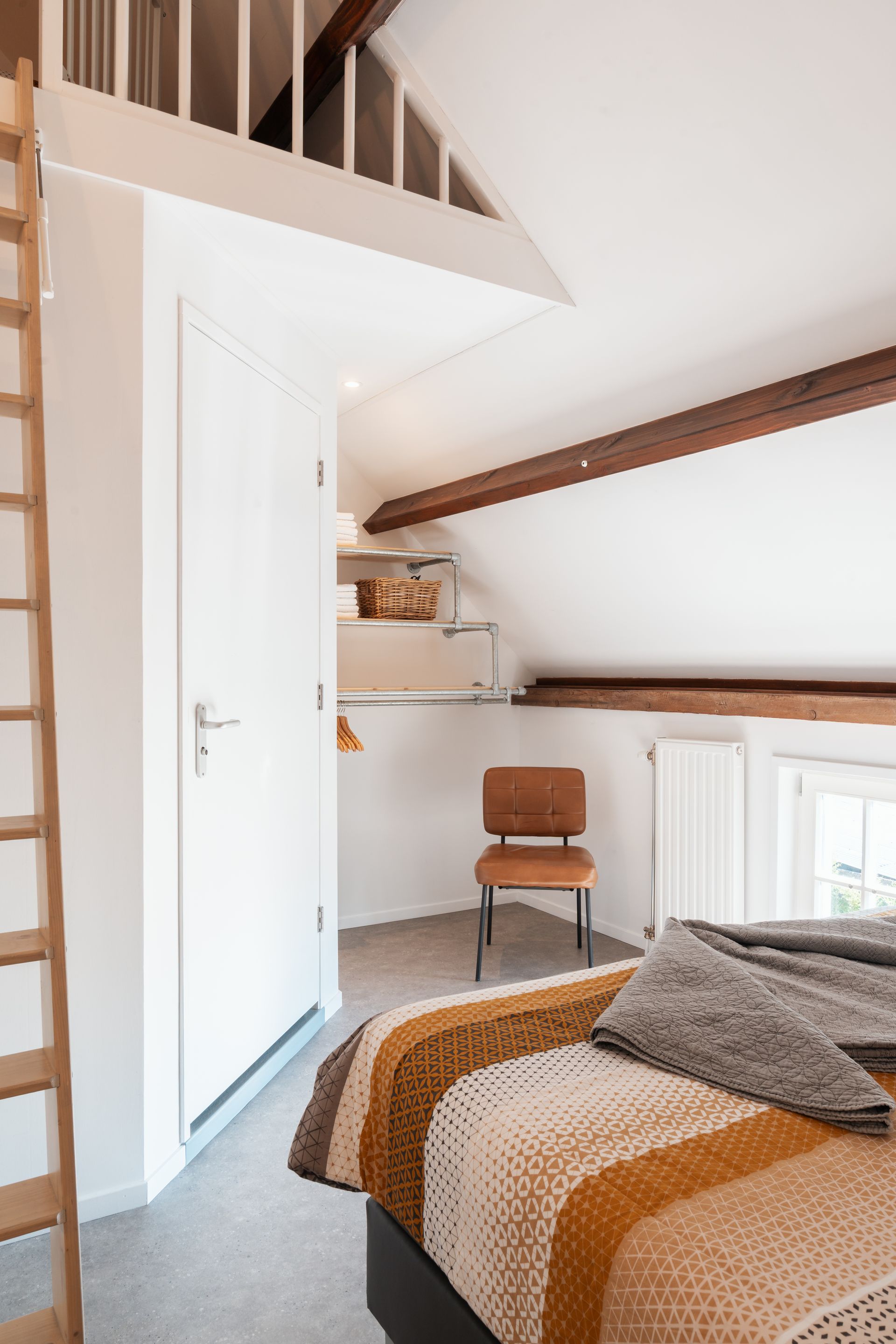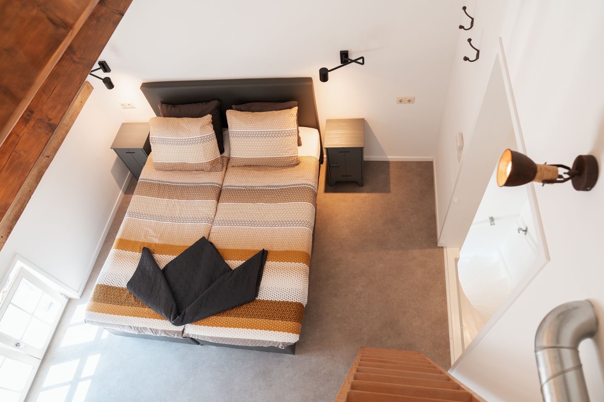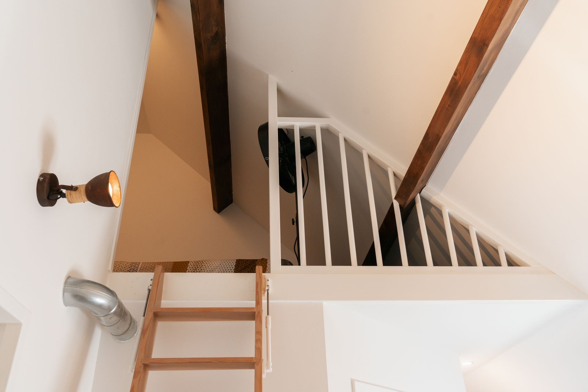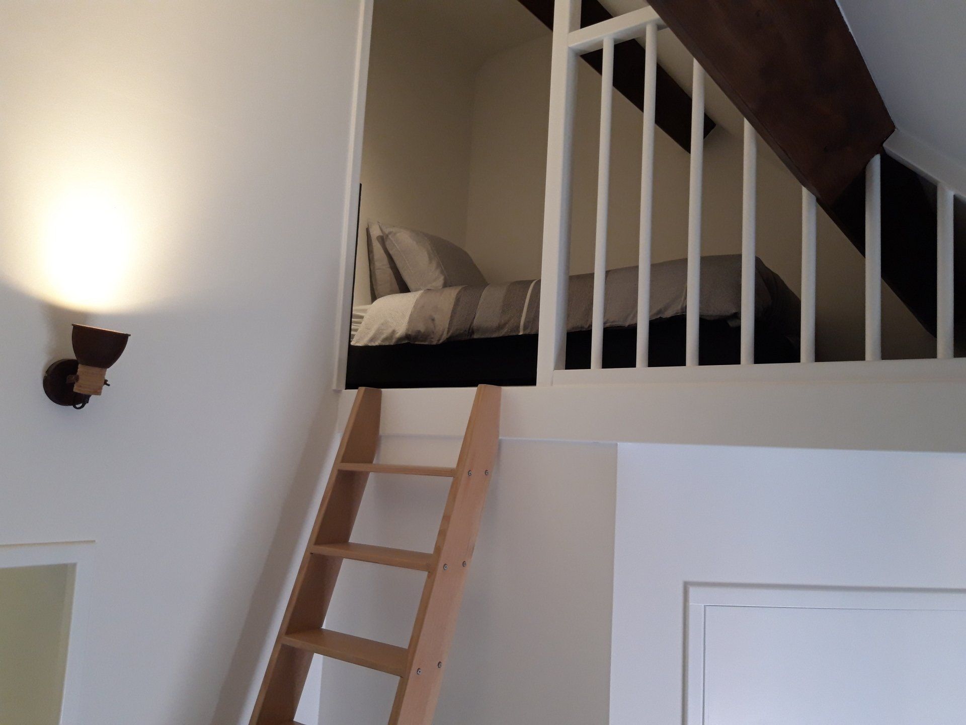 Über dem Badezimmer haben wir einen Schlafboden geschaffen, der über eine authentische Müllertreppe erreichbar ist. Hier haben wir einen charmanten Raum für den dritten Schlafbereich geschaffen.