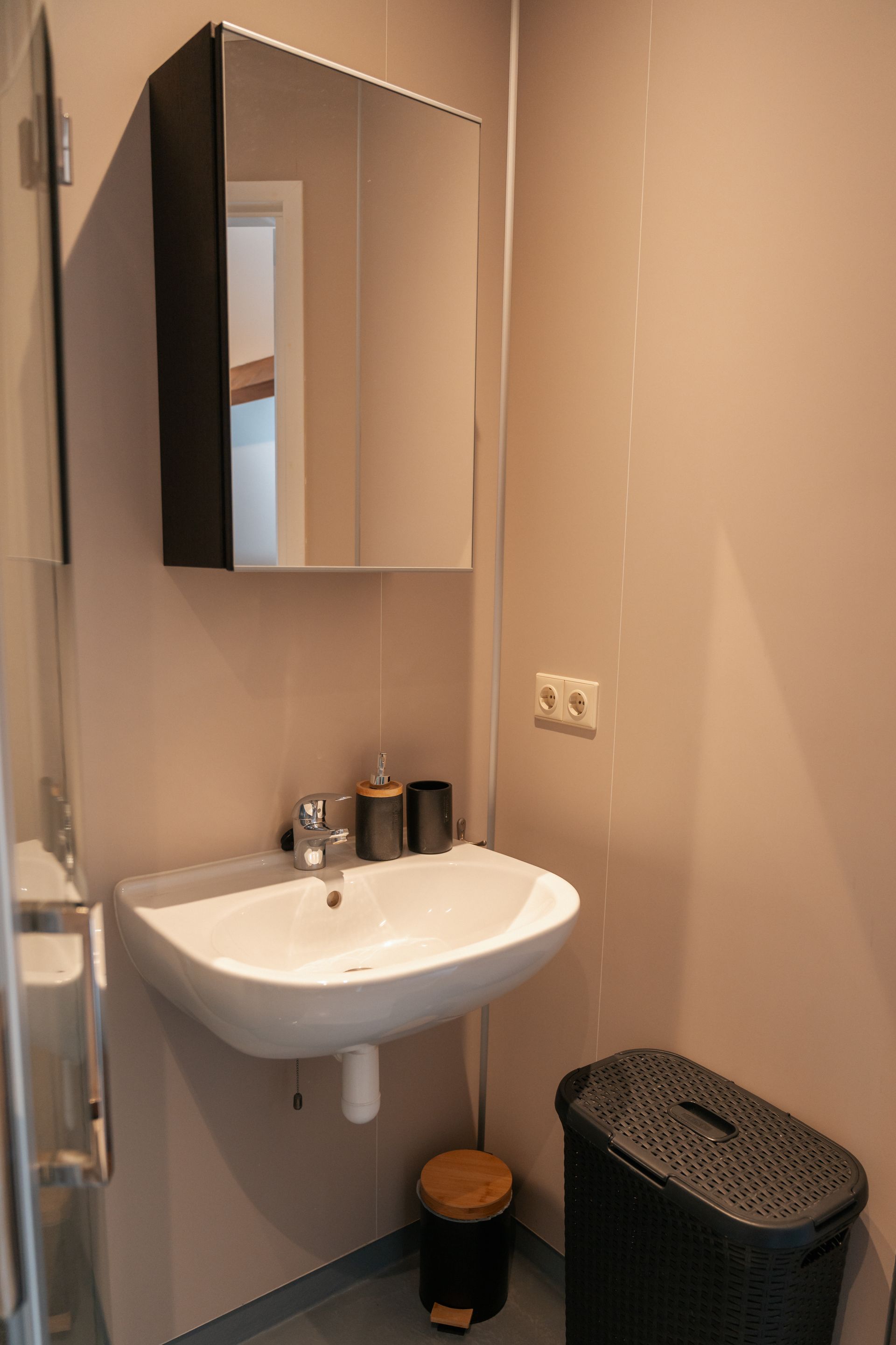Dieser Raum ist effizient gestaltet und bietet alles, was Sie für einen komfortablen Aufenthalt benötigen. Sie finden eine wunderbare Dusche mit Thermostathahn, der für die perfekte Wassertemperatur sorgt, sodass Sie jeden Morgen erfrischt und entspannt beginnen können. Es gibt auch eine Toilette und ein Waschbecken, beide sorgfältig positioniert für einfache Bedienung und Funktionalität.