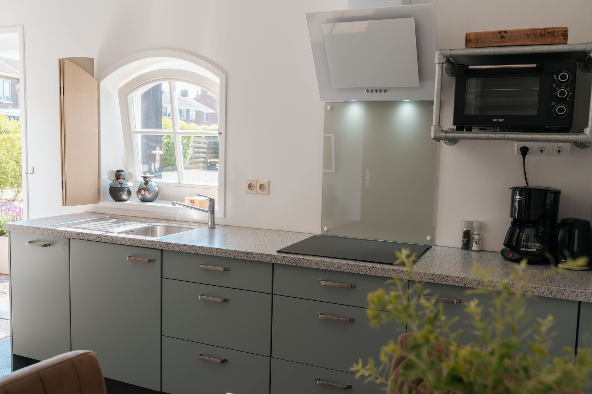 Zur Ausstattung gehören ein Kühlschrank mit Gefrierfach, eine Spülmaschine, ein Backofen und ein Induktionskochfeld.