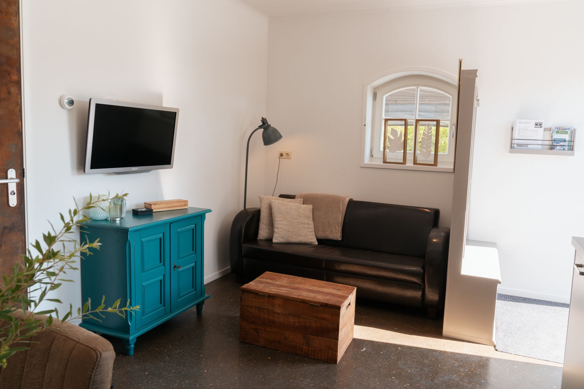 Sie betreten das Anwesen durch eine schöne alte Stalltür. Es gibt eine gemütliche Sitzecke mit einem Sofa für zwei Personen, einem Couchtisch und einem LED-Fernseher.